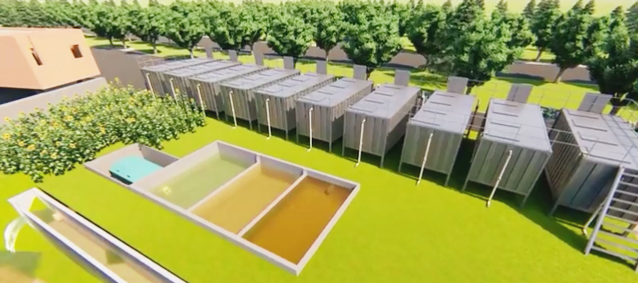 集裝箱式養(yǎng)殖系統(tǒng)采用 20 呎定制化“集裝箱”,尺寸是 6.1 米 *2.4 米 *2.8 米,養(yǎng)殖水體 25 立方米,占地面積為 15 平方米 ,配有納米增氧管(增氧)、出魚口(收魚)、集污槽(排污)、天窗(觀察投喂飼料)、固液分離器(尾水處理)等功能構件。